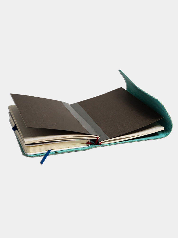 A vibrant Tiffany Blue shade, Cala is inspired by the pristine, crisp waters of Spain’s Islas Baleares. Crafted from vegetable-tanned cowhide sourced from Spain. Available in two formats: Drifter (A5) and Capsule (A6).