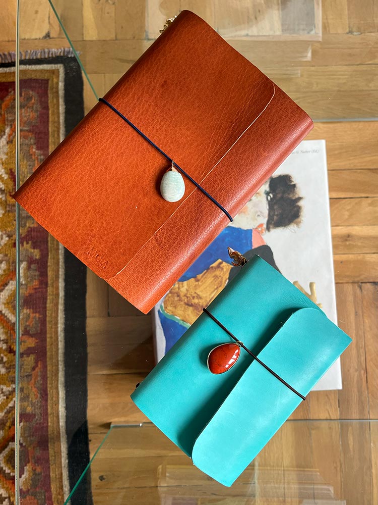 Product images are for reference only. Each journal is assembled by hand, and charm combinations and cord styles will vary. Made with genuine leather, so natural markings and slight variations in texture or tone are to be expected — no two are exactly alike.