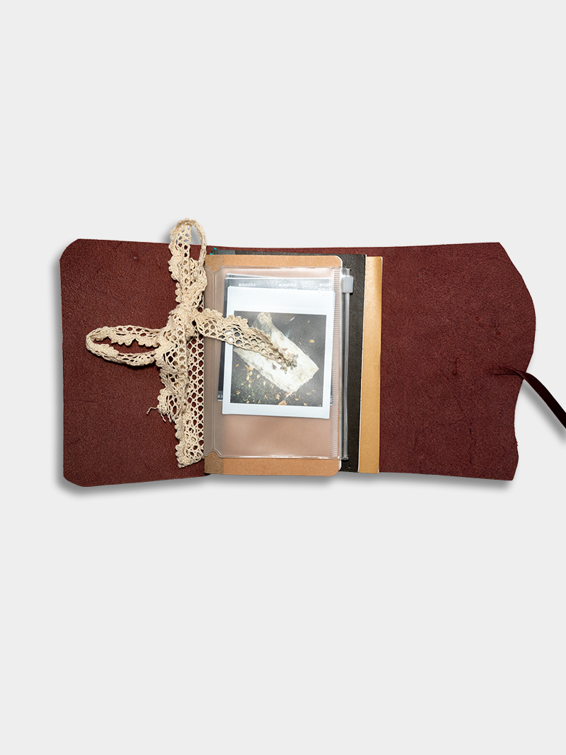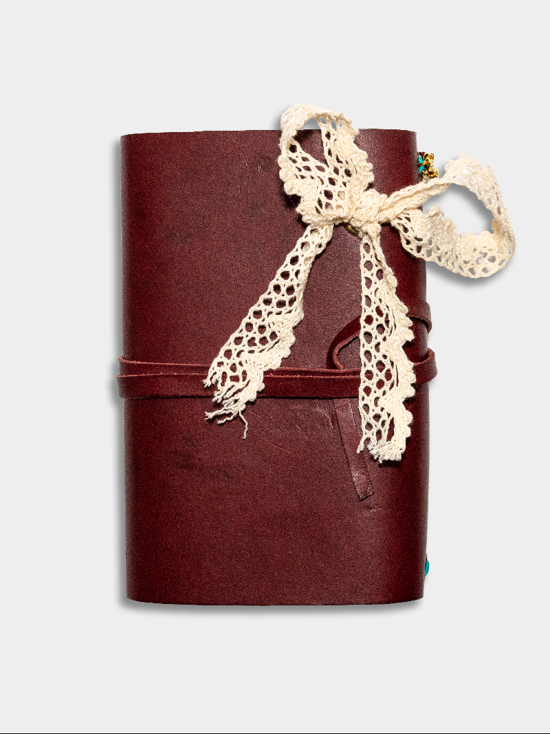In our signature Fig color, this Memory Vessel features a built-in cotton lace. Tie it as a front ribbon accent, an inner page detail, or a back ribbon that doubles as a bag chain. The lace is secured with understated gold accents and each Vessel is wrapped around by a leather cord.