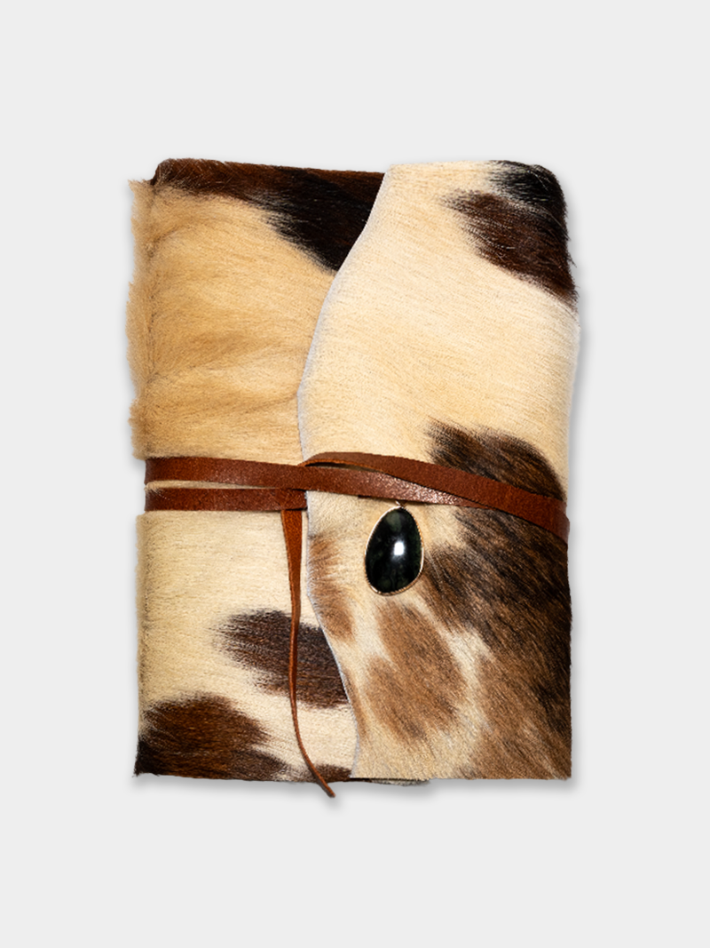Pinto, meaning "painted" or "spotted" in Spanish, is a line of limited-edition leather journals featuring asymmetrical hues of white, brown, and black. Crafted with pony hair cowhide leather sourced from Spain, and a wrap-around goatskin leather cord.