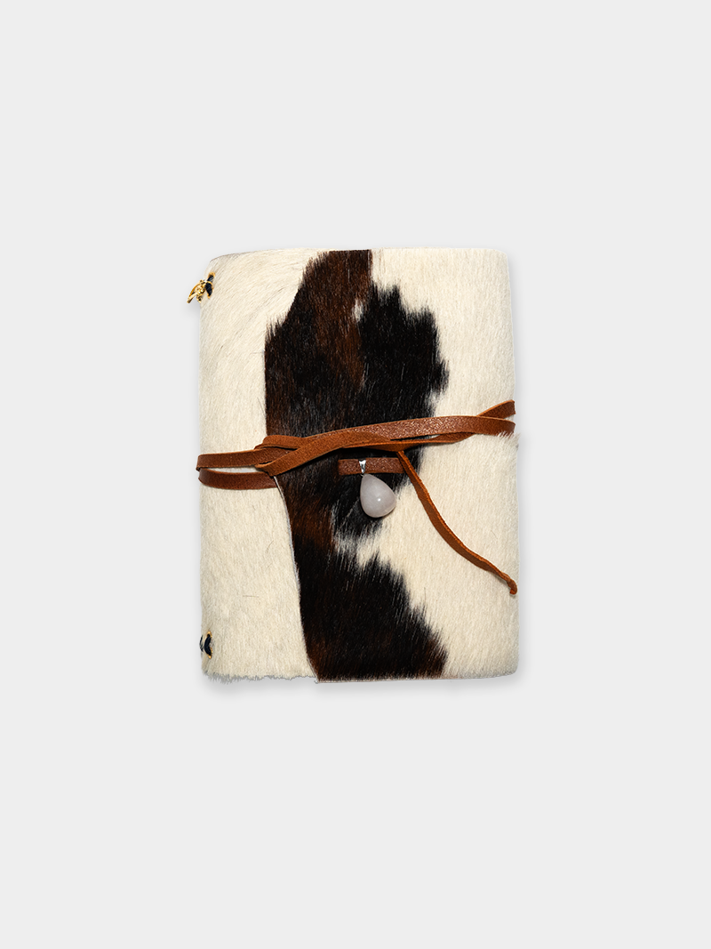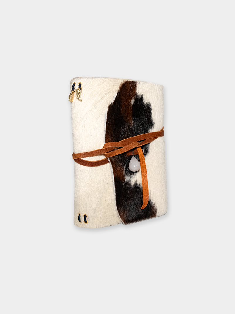 Pinto, meaning "painted" or "spotted" in Spanish, is a line of limited-edition leather journals featuring asymmetrical hues of white, brown, and black. Crafted with pony hair cowhide leather sourced from Spain, and a wrap-around goatskin leather cord.
