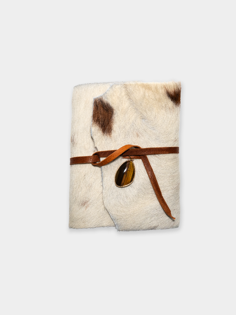Pinto, meaning "painted" or "spotted" in Spanish, is a line of limited-edition leather journals featuring asymmetrical hues of white, brown, and black. Crafted with pony hair cowhide leather sourced from Spain, and a wrap-around goatskin leather cord.
