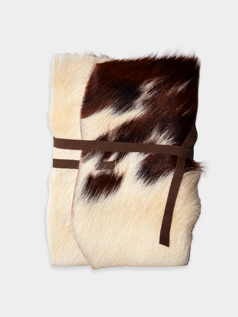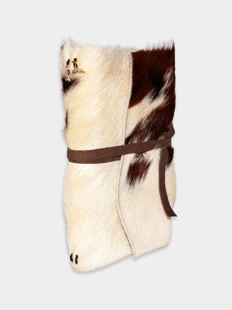 Pinto, meaning "painted" or "spotted" in Spanish, is a line of limited-edition leather journals featuring asymmetrical hues of white, brown, and black. Crafted with pony hair cowhide leather sourced from Spain, and a wrap-around goatskin leather cord.