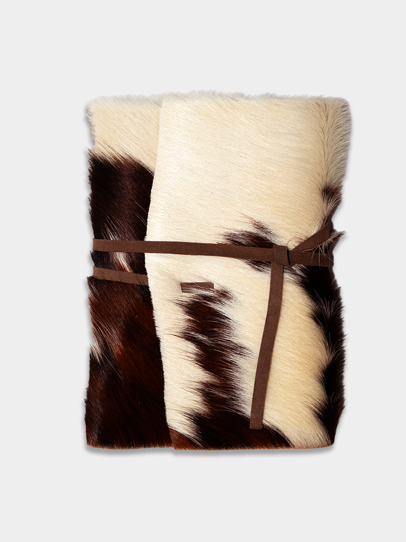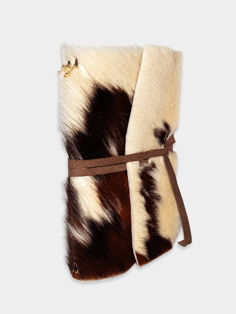 Pinto, meaning "painted" or "spotted" in Spanish, is a line of limited-edition leather journals featuring asymmetrical hues of white, brown, and black. Crafted with pony hair cowhide leather sourced from Spain, and a wrap-around goatskin leather cord.