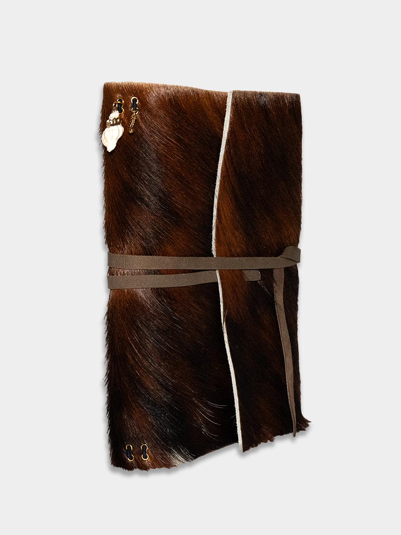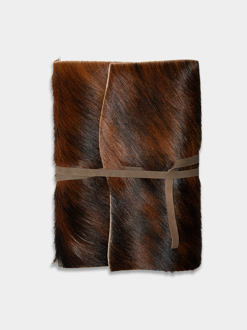 Pinto, meaning "painted" or "spotted" in Spanish, is a line of limited-edition leather journals featuring asymmetrical hues of white, brown, and black. Crafted with pony hair cowhide leather sourced from Spain, and a wrap-around goatskin leather cord.
